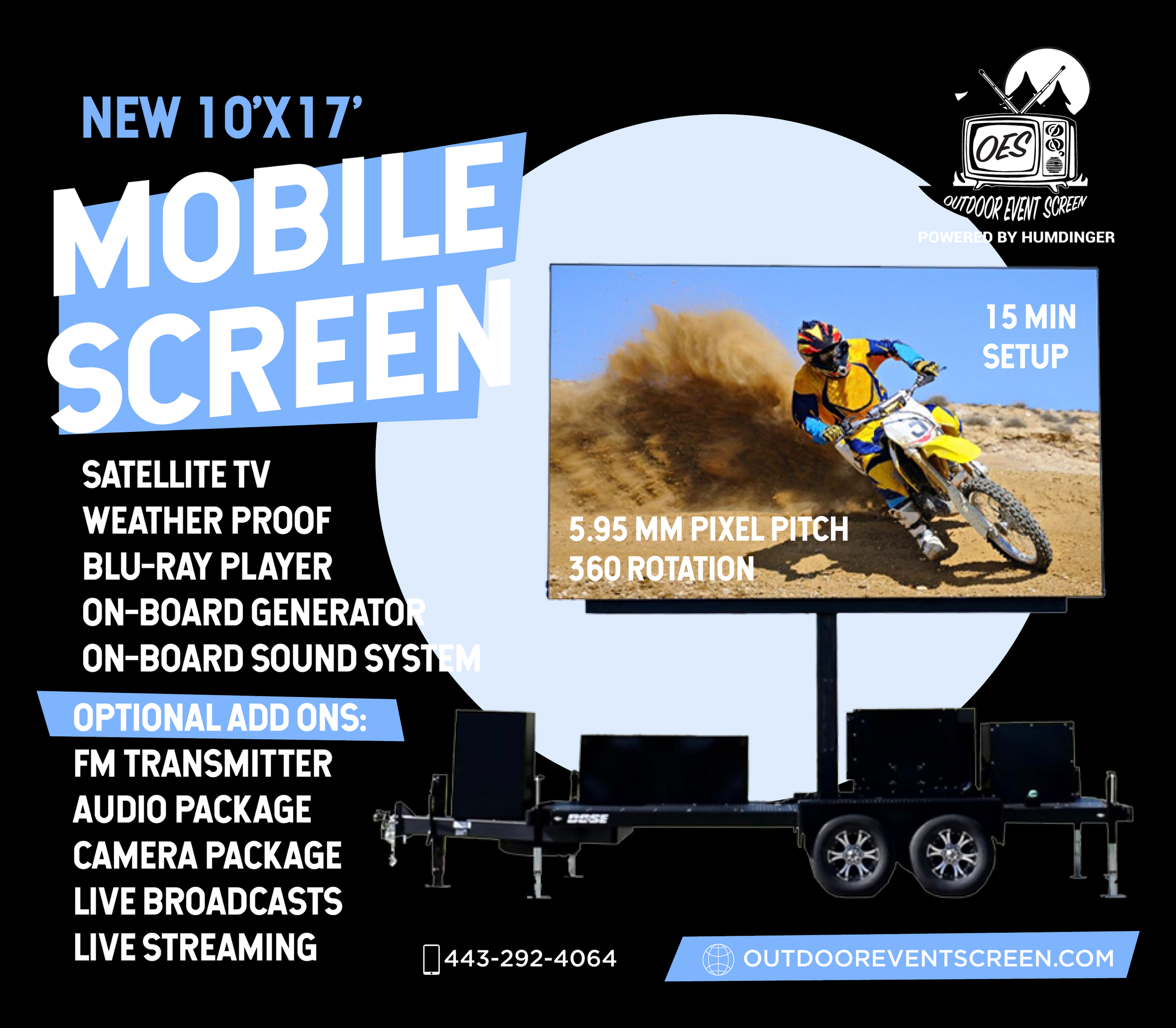 The mobile screen features 15 minute setup, simple 1 person operation, adjustable screen height, and a wide viewing angle to stun audiences of any size. There is even crystal clear viewing from close distances on this size screen. The screen's professional grade components coupled with its screen size make it an excellent well-rounded option for any size or scope of viewing requirements.