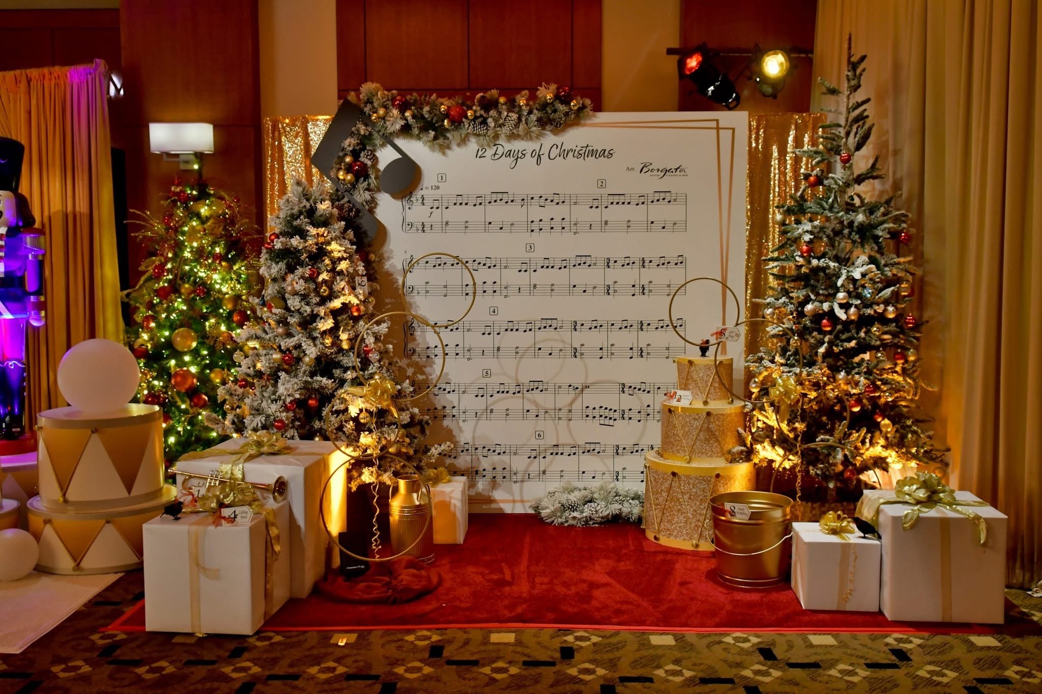Our team thoughtfully designed the decor with the classic song and gold elements in the foreground. The elaborate entrance and 4 photo ops highlighted each encapsulating verses of the song and our festive chandeliers accented the event space like classic holiday trees.